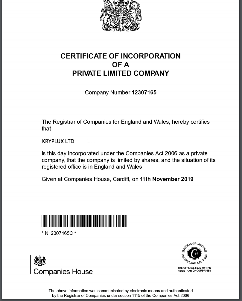 Our company is legally registered in the Europe as “Kryplux , LTD" .Company № 11692905.To download certificate click here